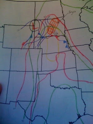 Later that day they our storm team in the plains caught up with a supercell near the WY/NE border and tracked this storm for several hours that did produce a tornado which was missed but they saw some funnel clouds and wall clouds. The next day several tornadoes were observed as they tracked a storm from the inital formation. In order to do this the forecast thinking for the day had to be dead on with where storms would develop and this was the case. Here is there forecast map for May 22nd.