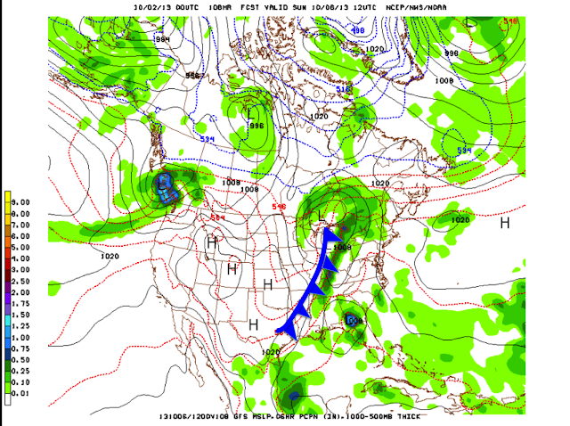 | GFS Mean Sea Level Pressure and Precipitation valid 12 z (7 am CDT) for Sunday, October 6th. |