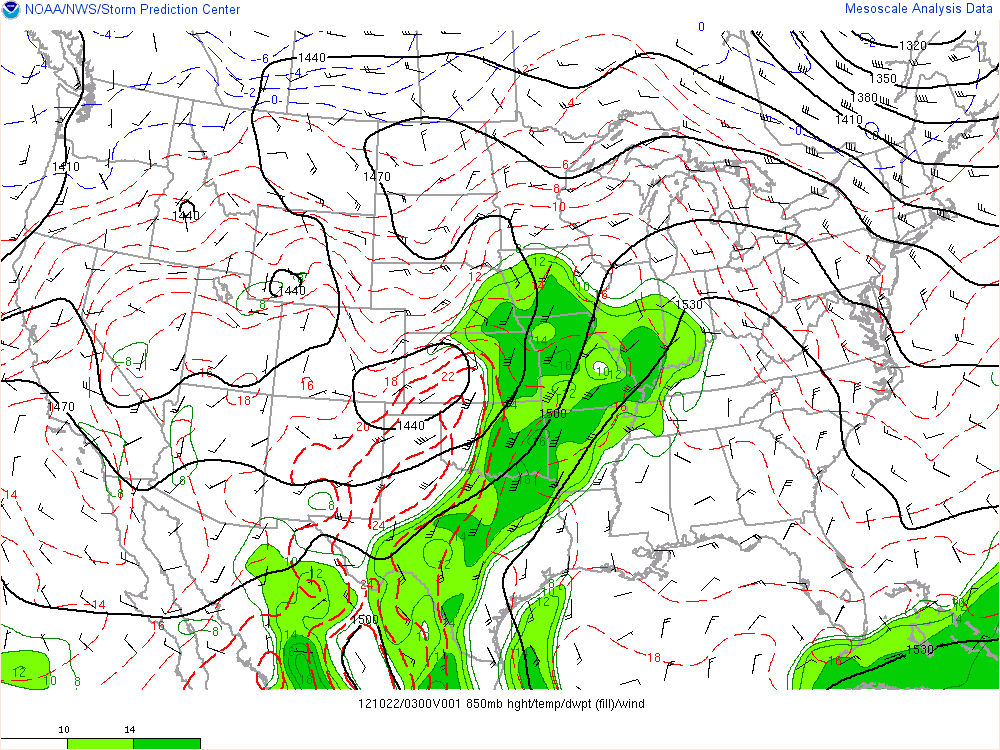 The SPC Mesoscale Analysis 850 mb temperatures, dewpoints above 50 degrees F, and heights valid 11pm 10/21. The moisture axis across the central US is clearly visible, as well as the high pressure shielding our area.