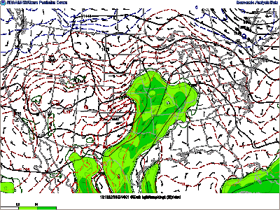 NAM forecast vertical velocity (rising air) at 7 pm Saturday. Increased vertical velocity here in southern Kentucky at this time just ahead of the shortwave (yellow dashed lines) indicates rising air and thus a chance of rainfall.